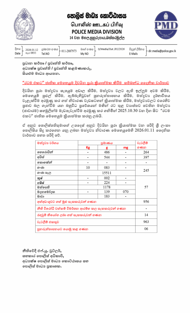 ‘රටම එකට’ ජාතික මෙහෙයුම යටතේ, පොලිසිය විසින් ඊයේ (11) දිනයේ මත්ද්රව්ය වැටලීම් 963 ක් සිදු කර ඇති අතර එම වැටලීම්වලදී සැකකරුවන් 956 ක් අත්අඩංගුවටද, 06 දෙනෙක් පුනරුත්ථාපනයටද යොමු කළ බව පොලීසිය ප්රකාශ කර සිටියා.