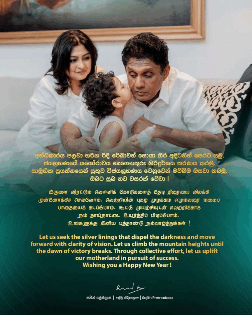 “අන්ධකාරය පලවා හරින රිදී රේඛාවන් සොයා තිර අදිටනින් නව වසරේ පෙරට ගමන් කරමු” යැයි විපක්ෂ නායක සජිත් ප්රේමදාස පවසනවා.
