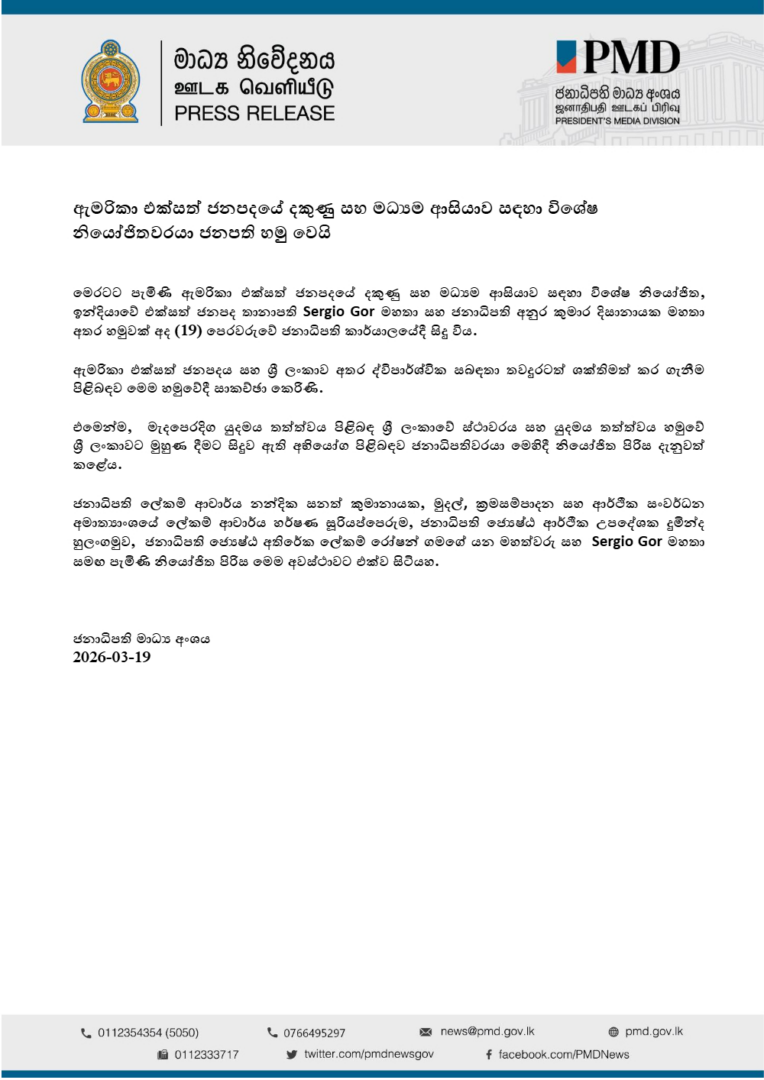 මෙරටට පැමිණි ඇමරිකා එක්සත් ජනපදයේ දකුණු සහ මධ්යම ආසියාව සඳහා විශේෂ නියෝජිත, ඉන්දියාවේ එක්සත් ජනපද තානාපති Sergio Gor සහ ජනාධිපති අනුර කුමාර දිසානායක අතර හමුවක් ඊයේ (19) දින ජනාධිපති කාර්යාලයේදී පැවැත්විණි.