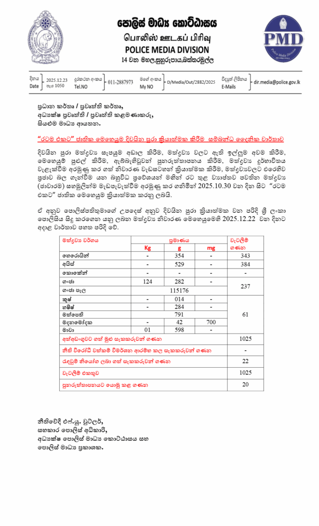 “රටම එකට” ජාතික මෙහෙයුම යටතේ, පොලිසිය විසින් ඊයේ (22) දිනයේ මත්ද්රව්ය වැටලීම් 1025 ක් සිදු කර තිබෙනවා.